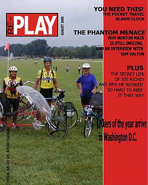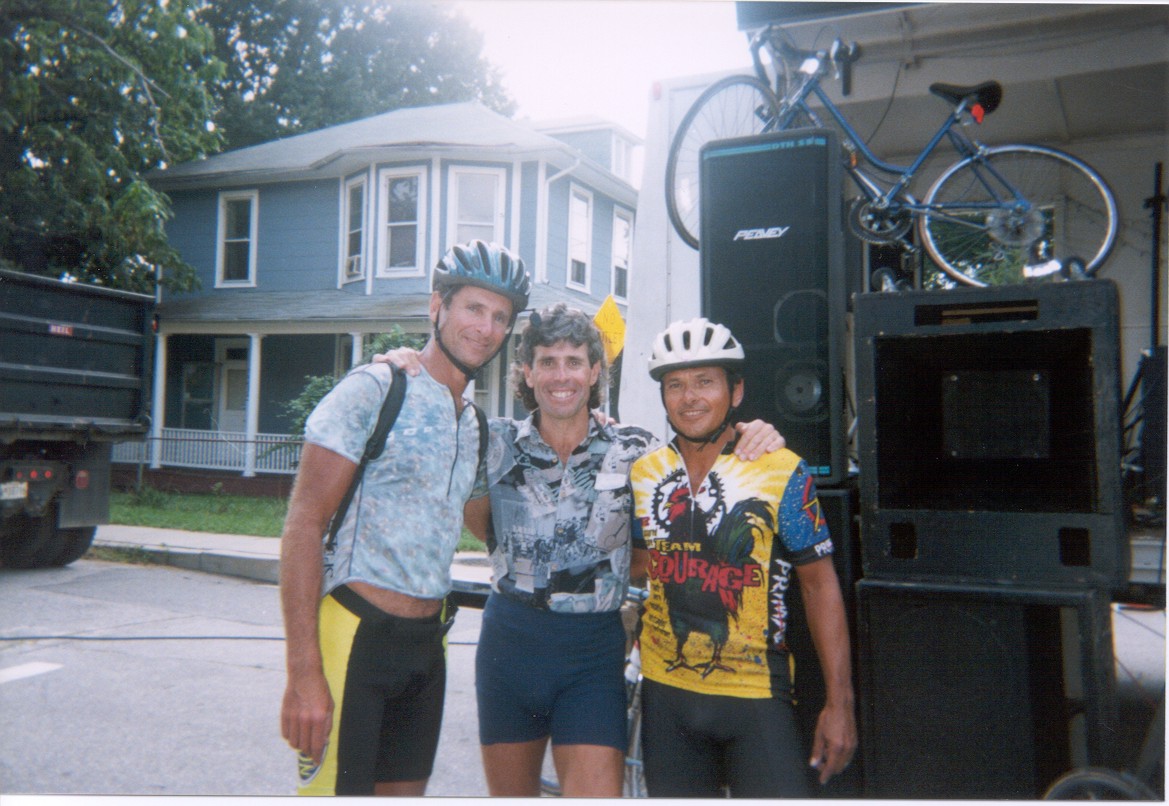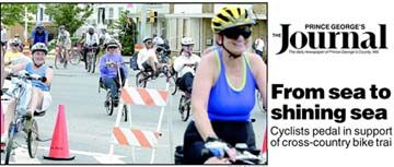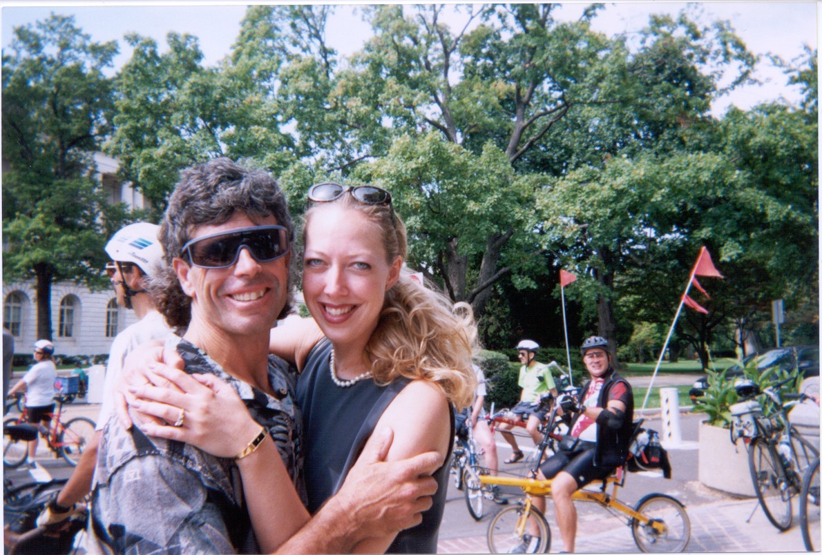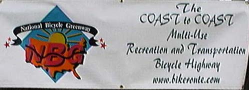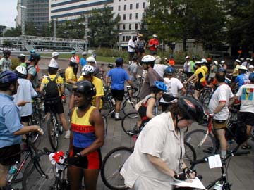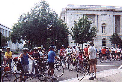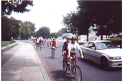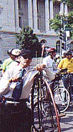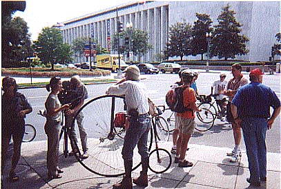 | On what ended up being a rare beautiful from sun up to sun down August day in Washington DC, around a thousand cyclists found their way to either our rally in DC, to our festival in Mount Rainier or both by the time it was all said and done. The morning began with gusto as world TransAm hi-wheeler champ Steve Stevens blew the cavalry charge that symbolically sent hundreds of cyclists from five different staging areas to the downtown Washington DC Capital. The largest group left from the Mount Rainier Nature Rec center where the night before a small number of cyclists camped and probably twenty people enjoyed bike movies and the interviews of several of our TransAm cyclists, Monty Clish and Bill Tucker (Seattle to DC) and Dale Lally (Miami to DC). Arriving at the Festival site on the awesome tandem trike that College Park Bikes had generously loaned me for my stay in Mount Rainier (at Mayor Fred Sissine's house) and for this event, we found Mike Lawson and his crew of city workers busily getting the stage and tents and displays, including the NBG storyboard that Gayle Michael had built for us, etc, set up for our festival. I also found longtime NBG advocate Lindsey Hackman. Lindsey and I had never met before and during the two + years that we had been corresponding as she helped from the DC area where she lives, we had gotten to know each other somewhat. I had even given her some coaching when she did her own TransAm during the summer of '98. As such I made her my stoker for our ride to downtown DC. |