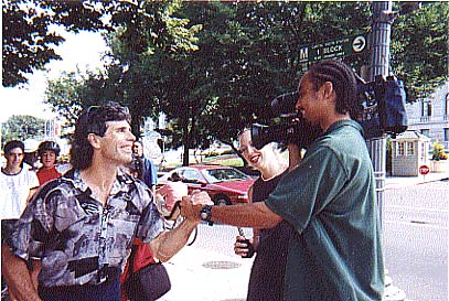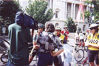 | Led by Branch trail powerhouse, Steve Mckinley-Ward, and with the rear held up by former world class bike racer Otis Hayward, we made our way to the Capital easily and joyously. Once there we found our way on to the route that Col. Dan had worked up for us on the downtown streets where we were met by probably over a hundred other bike riders. We regrouped at Independence Square where one head count of cyclists present was set at 230 people. From there, we biked back to the top of Capital Hill and it is a hill -- not steep but with enough rise over run to string all of us out just a little bit. Our return found the publicist that Hampton Roads Transit had loaned us for the day, Joanna Beeman, busily choreographing the TV news cameras that were present. She arranged interviews with LA to DC TransAmers Al Ramos and Mauny Murray, (pictured with NM to DC Joe Richey at right) she made sure that radio personality Renate Dallas (see pic), and the Connecticut girl twins told the media why they had ridden with us and Joanna also made sure that they had an audience with Steve Stevens and myself. From there maybe 50 of us biked down to the west steps of the Capital, which look out to the mall and the Washington Monument where the Bike Aid TransAm group had already assembled. There I gave them a 10 minute talk, the subject of which was "Leading by Example". I exhorted the young riders present, 50 in all, to use the achievement they had had of biking across America to inspire others to use their own bodies to move themselves about by staying as Car Free as they could. When I was finished, we rode back down to the bottom of the hill where we regrouped once again with the rest of our NBG riders where we found the brothers Max and Mark Chen who kept their own website as they rode here from Portland, OR. When Steve Stevens sounded his horn, once again we were off. His small horn, which he wore like a wine flask, an antique made in the late 1800's, was incredibly loud. It added to the excitement we felt coming in and now as we headed back to Mount Rainier. |