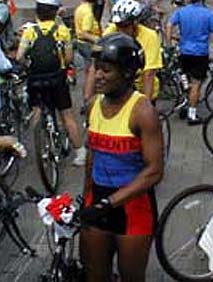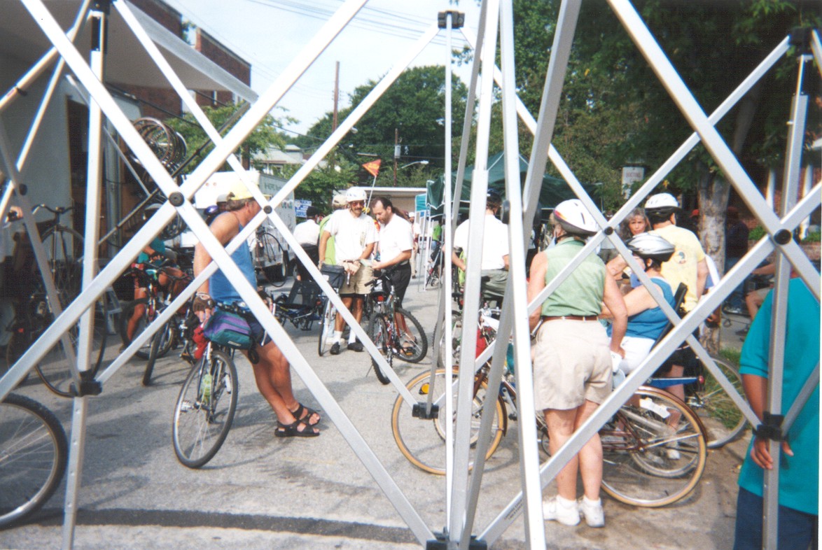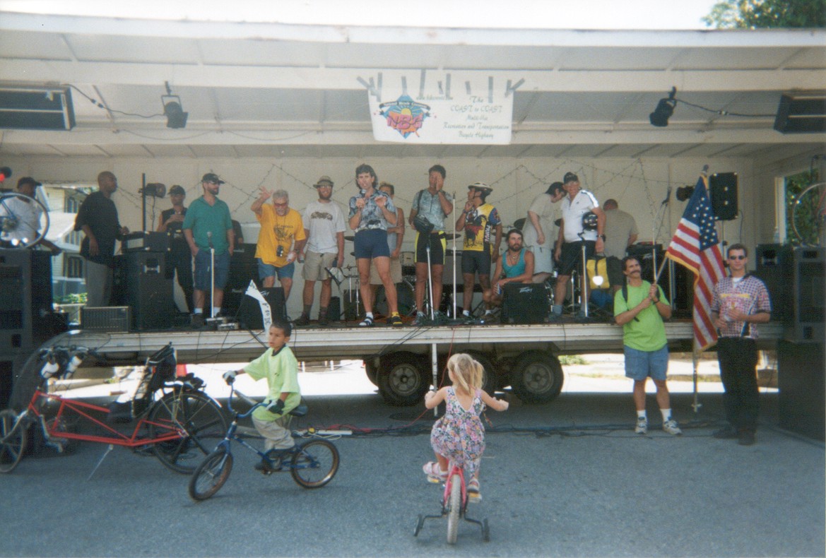 | And yet, he was so inspired by our event that he told me he will ride across the US when I do it again. He made this pronouncement after he discovered what his recumbent riding business partner, Chris Doyle, has known all along when he rode my trike, that one can be comfortable on a bike!) was busily preparing. He cut and then squeezed case after case of fresh oranges. As the heat grew and the need for liquids increased, the Grainaissance amazake drink arrived to supplement one very busy Michael's juice offerings. People were standing 5 and 6 deep in line when our Odwalla juice delivery then arrived. They had had had a flat tire on the way and it got here just as our amazake and poor Michael's arm were just about ready to give out. While all the while both Peter Koskinen of Softride and Phil Koopman of City Bikes fixed bike after bike for the local kids and band after band blasted their high voltage tunes from the stage that that Michael Lawson had arranged for us. High atop it's roof was our banner which reads; "National Bicycle Greenway, the multi-use recreation and transportation bicycle highway". The Bilenky Cycle Works Band, of which the lead singer Janet Bilenky and her daughter, Ruchama, the bass player, were dressed in beautiful period wear that set them apart from everyone present, waited patiently as the stage stayed busy with music and speakers. Our TransAm riders came before the F e s t i v a l crowd for their important introductions and a few of the brief interviews that I hosted. We were so busy having fun that we didn't realize that our bicycle acrobats had not arrived until it was time for them to come on for their first show. As it finally turned out, Perfection on Wheels went to the wrong city somewhere two hours away in Maryland. To make matters worse, Dennis Langlasis's (their manager) cell phone stopped working so they couldn't access him for the proper location and when they many hours later figured it all out, his team with their ramp and truck and bikes, then got a flat tire. |