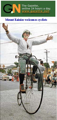 | On the five mile route engineered by Car Free Mount Rainier Mayor Fred and Bicycle Space owner Phil Koopman, children (one as young as six) joined seniors (see pic), one with a festive NBG, NBG, NBG hat, Ruth Maki, and another whose bike read 'Seniors for NBG', and human powered vehicles and other recumbents and three speeds and ten speeds and racing bikes and clunkers from far and near as we formed one long continuous string of happy bike riders. In festive fashion, we honked our horns, rang our bells and called out to all those who watched us from their still sleepy Sunday morning doorsteps to join us. |
