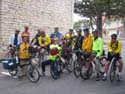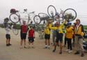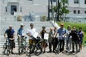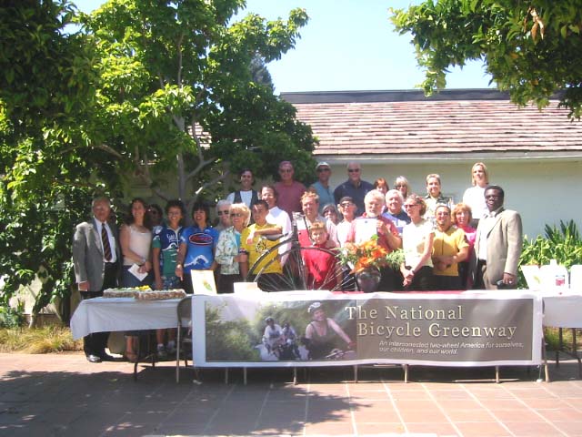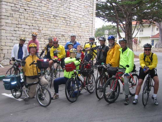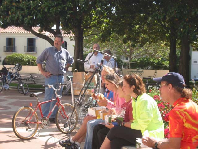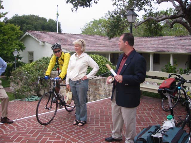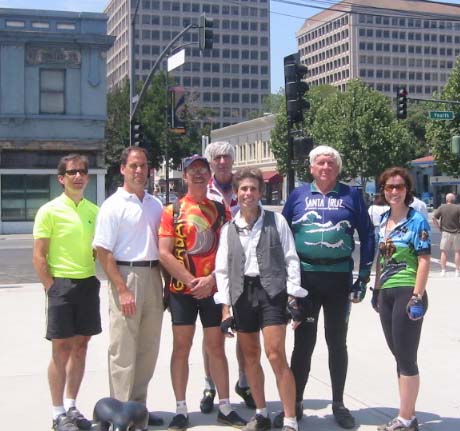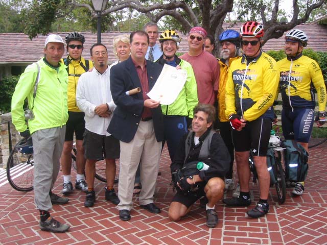 Jeff Haferman, Monterey Councilman, surrounded by Velo Club Monterey Members, Todd Bennet, Sr Planner (in tie) and Santa Cruz bound cyclists