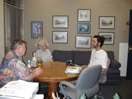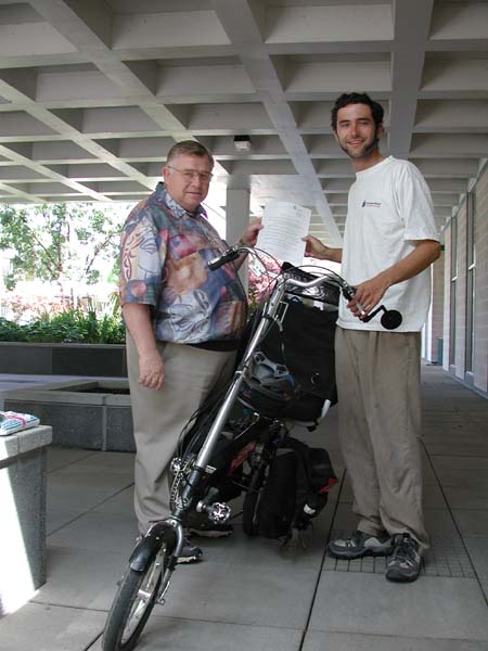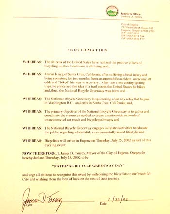 Andrew arrived early for his meeting with Mayor Torrey. Unfortunately noone from the media or from the bike groups in town were able to attend. However, we had a great visit with Andrew; he is a delightful ambassador for the NBG. Mayor Torrey presented Andrew with a proclamation supporting the National Bicycle Greenway, and a T-shirt that says "Eugene Likes Bikes." |