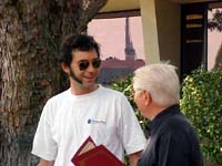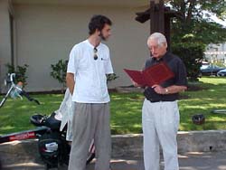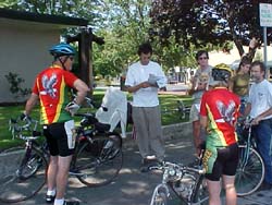 | RICHMOND, CA 08/05/02 - Up early and with only with a few things to do before meeting the Mayor, my host Peter showed me a short loop I could take out through some of the vineyards. It was great. I got a couple pictures and saw some beautiful country side spread over rolling hills. By the time I was done I felt like I'd earned breakfast. I stopped in at Bicycle Madness and they sold me a bike map of the North Bay and a new rear tire. Replacing the cheapie I got in Chico with another slightly less cheap tire that would run at 110 psi instead of 65 psi was a major improvement. I picked up 2-4 miles per hour on my average speed. Back on Friday in Sacramento while I was waiting for the guys at City Bikes to swap out the derailleur I met a lady named Sandy working there who lived in Napa. I told her about the ride and that I'd be going through there on Monday and meeting the mayor. She was interested and said she'd |