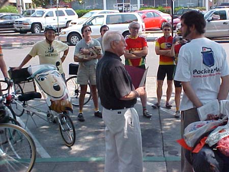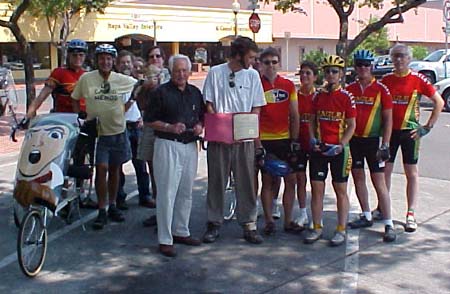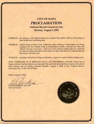 Sandy really got the word out. After the events in the last three cities having little participation from local cyclists--mostly because we weren't able to find the Sandy in each town that could let the right people know about it--I was blown away to see the 10-15 cyclists, some on recumbents, that showed up. The fact that that many people turned out from a relatively small town made a big statement: a lot of people care about safe cycling in Napa. Best of all the Napa News was there with a reporter and photographer to document the whole thing. [ I'm told there are a few inaccuracies but you can read the article (here). Mayor Ed Henderson came out read and then presented me with a proclamation declaring August 5th National Bicycle Greenway Day in Napa. We got some photos taken, talked to the news paper reporter, then the riders escorted me out of town. Before they left they showed me the best way to get down across the bay into Martinez. |