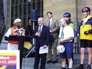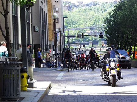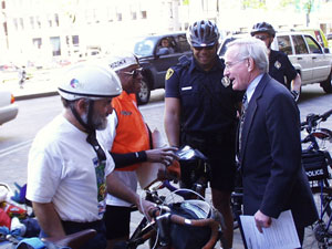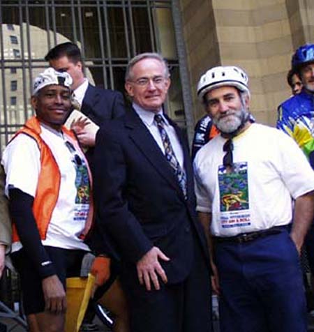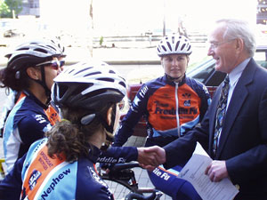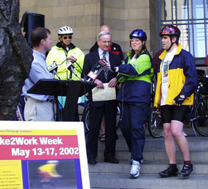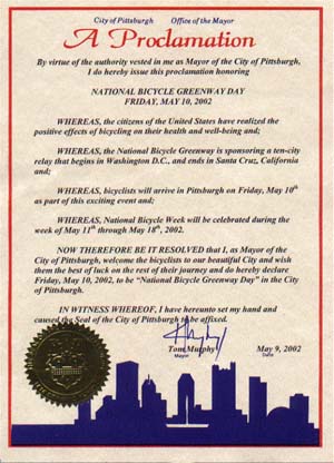 Gil and Dave came in smiling (wearing our Pittsburgh t-shirts) and to great applause from the crowd of people assembled here. We had two different television stations, our two newspapers covered it and two radio stations giving a play-by-play. They had a motorcycle police escort to our building - followed by five members of our bike police, the Freddie Fu contingent, the riders who are going to carry on with the relay, and some of our bicycle clubs sent members. It was quite an event. The press conference lasted over 1/2 hour and the Mayor was very happy since he is also a cyclist. I don't know how well our proclamation is going to travel - the Washington, DC one looks pretty wrinkled, wet and shabby - but I told Gil and David that it was testament to the type of weather and conditions they've been through. There were a lot of very happy people outside today - and it created a stir among those who do not cycle now - but plan to do so soon. There were times, I must admit, that I didn't think we would be able to pull this off - but we did and it was great fun.