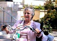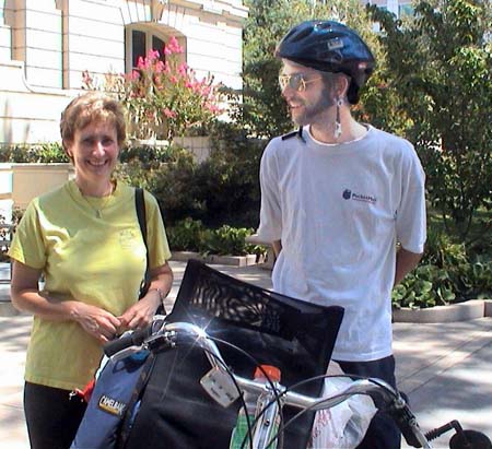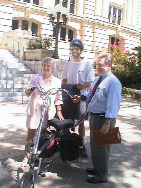 | SACRAMENTO, CA 08/02/02 - I woke up with forty-something miles to go and not a lot of hours. I got off to a good start but as the day heated up the wind picked up. Not wanting to be late again, and this time for reasons solely within my control, I started really pushing. I rode down CA-99E, taking the last turn off before it merged with I-5. Stopping only once to buy a couple of Powerbars, I navigated the back roads on into the city. Just as I was about to ride under I-80 Carol, with the mayor's office, called. She got me on a rails to trails path that let me finish up the last 10 miles on Sacramento's amazing greenway system. I met up with Velda, a Roseville cyclist, and her son Chris at Discovery Park around 11:30. Ed Cox the Alternative Modes Coordinator with the city rode up a few minutes later followed by Carol and finally Joe, a rider affiliated with a few cycling clubs. Ed, Chris, Joe and I took a riding tour of some of Sacramento's bike and pedestrian facilities on the way to City Hall. We got there a little before 13:00, Carol and Velda, who had driven back, met us shortly there after. The Mayor had gone home sick so the Parks and Recreations Commissioner stepped in and presented the proclamation in her place. Pictures were taken all around and a few people took a try riding my bike as I watched nervously shouting encouragement, "good, good, don't crash, just put your foot down" that sort of thing. |