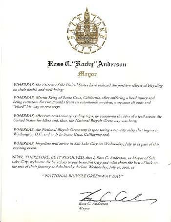 At the reception (not a large crowd, about 20), I was pretty nervous but it was exciting to meet Mayor Rocky Anderson, his bike coordinator, Lisa Romney, and the area Ch. 2 news lady with her cameraman. Lisa gave me a Salt Lake City Bikeways Map that helped me get out of the City center. I am putting away the Salt Lake City Map and looks like it will be the Utah State Map for my trip into Ogden from here.